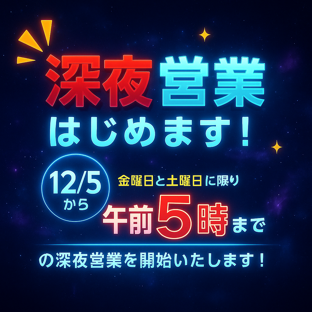 いつもご利用いただき、誠にありがとうございます。このたび新宿店では、より多くのお客様に快適にご利用いただけるよう、2025年12月5日より金曜日・土曜日限定で深夜営業を開始いたします。営業時間は午前5時までとなります。お仕事帰りや遅い時間のご来店でも、安心してご利用いただけます。スタッフ一同、皆さまのご来店を心よりお待ちしております。