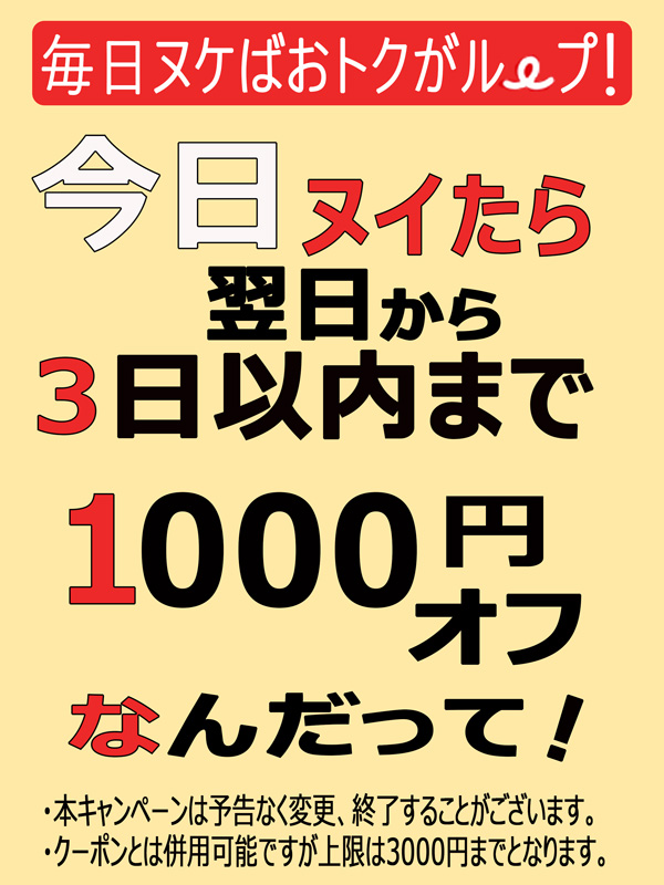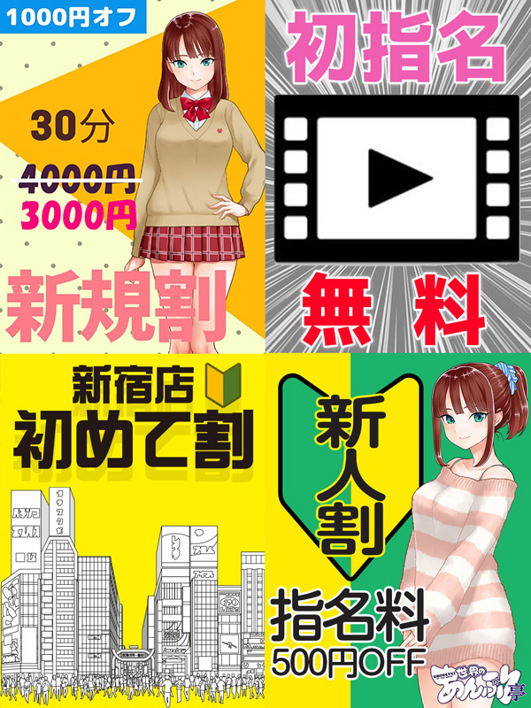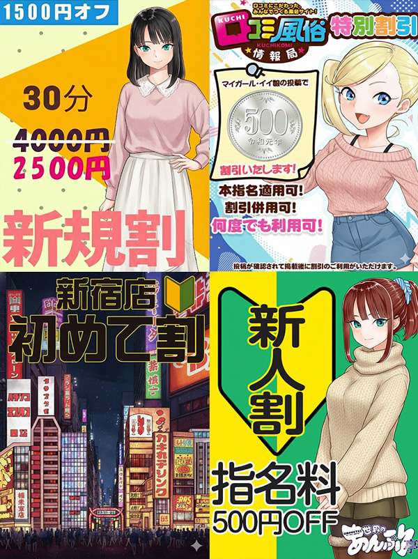 ◻◼ イイ娘投稿で500円引き ◼◻ 5/10よりスタート!マイガール、イイ娘の投稿で500円割引! 口コミ情報局でマイガール登録し、イイ娘の投稿をしていただくだけでOK! 投稿は2〜3分でできます! ・口コミの掲載はご本人確認後の掲載になります ・他の割引と併用可 ・本指名のお客様でも利用可 ・何度でも利用可 ※お客様が口コミ投稿後、店舗側管理画面へ反映されるまで時間がかかる場合がありますので、ご了承お願いします。詳しくはこちら